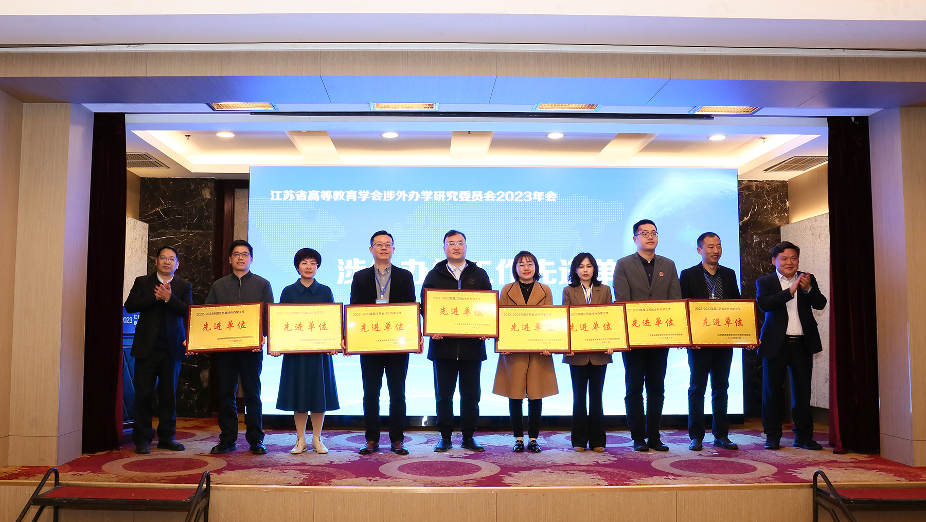 3月28-29日,2022-2023年度江苏省高等教育学会涉外办学研究委员会年会在江苏师范大学召开。会上对全省涉外办学先进单位进行了表彰,我校荣获2022-2023年度江苏省涉外办学先进单位,原爱尔兰学院副院长平毅老师获评2022-2023年度江苏省涉外办学工作先进个人。爱尔兰学院党总支书记李湘、院长张晓明、副院长蒋宏成等分院领导一行参加了本次会议,张晓明院长代表学校登台领奖。