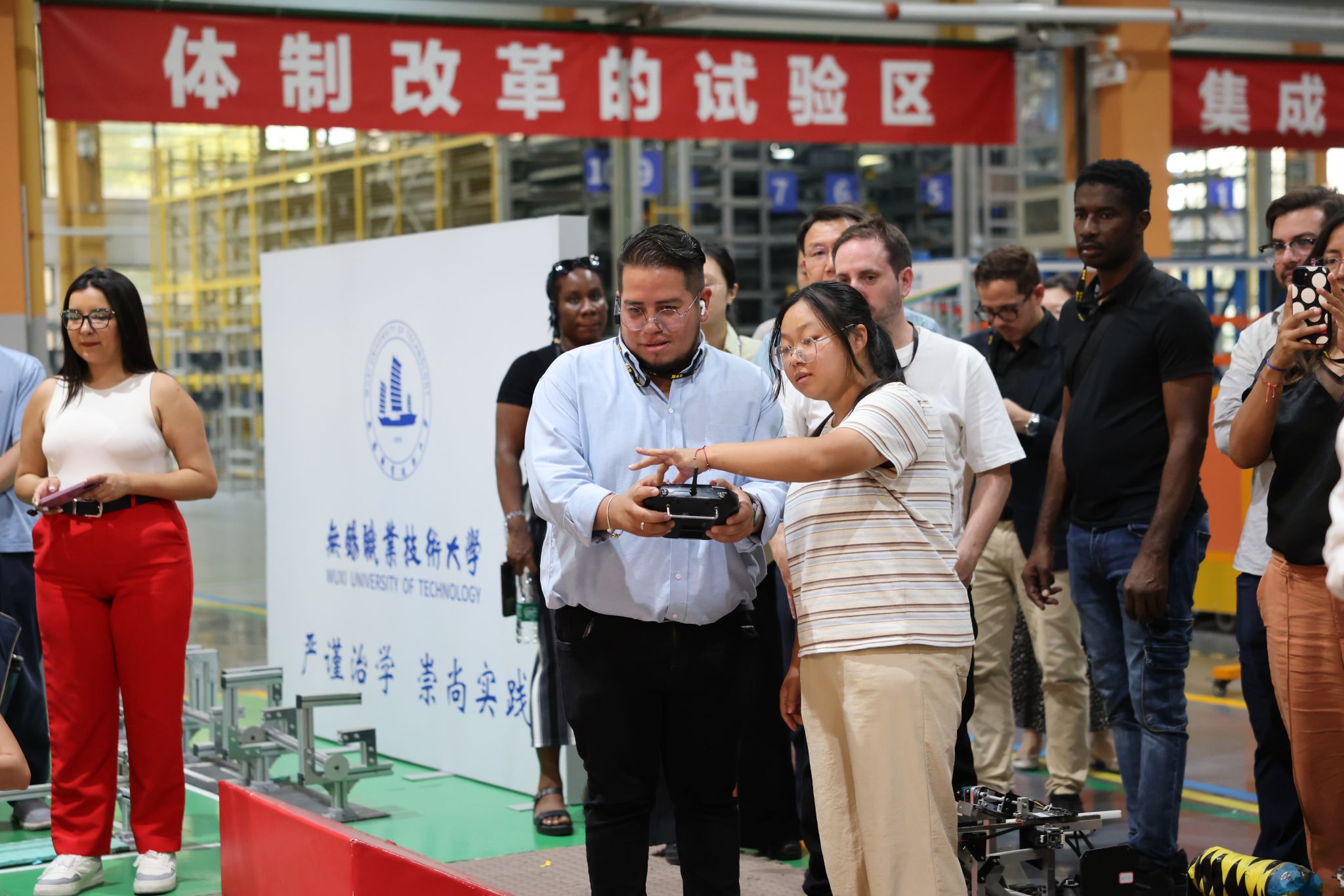 代表团一行先后参观了我校艺术与设计学院、智能制造工程中心及汽车与交通工程学院。我校教师向嘉宾详细介绍了绎江南文化传承创新基地、彩色泥塑作品《两个江南 血脉相连》、智能仓储物流测试验证平台、机器人竞赛与创新中心、虚拟仿真实验室、以及比亚迪汽车产业学院等一系列教学与科研成果,向代表团呈现了非遗文化与智能制造的创新融合。