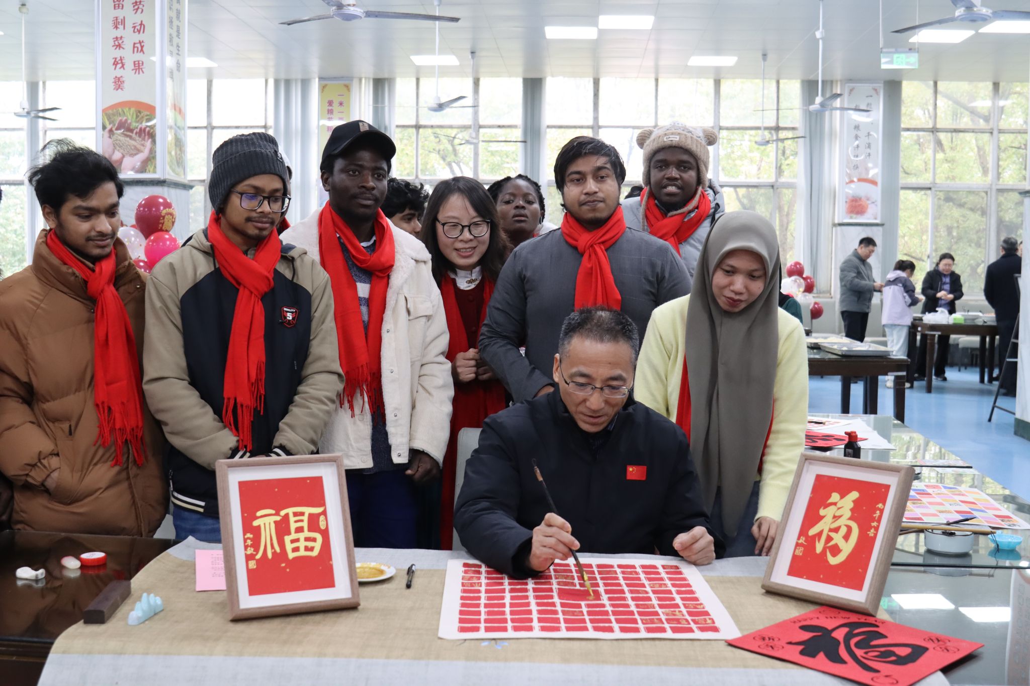 活动在墨香与欢笑中拉开序幕。校领导们与中外学生齐聚一堂,共同提笔书写“百福图”。一方方红纸上,中外师生专注挥毫,不同的笔迹汇聚成对幸福吉祥的共同祈愿,在笔墨交融中悄然完成了一次深刻的文化互鉴与情感连接。随后,党委书记龚方红发表热情致辞,介绍了学校在教育对外开放领域取得的丰硕成果,强调学校始终坚持开放办学理念,致力于为各国学子提供优质职业教育,并积极推动中外人文交流与文明对话。他勉励中外学生珍惜同窗之谊,互学互鉴,共同成长,并为大家送上龙年新春的美好祝愿。紧接着,龚方红书记与周桂瑾校长亲手将满载祝福的“福”字赠予学生代表,将吉祥如意传递给每一位学子。