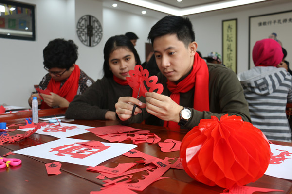 1月22日下午,在国际教育学院孔子课堂,70多名来自南非、印度尼西亚、东帝汶、马来西亚、蒙古、哈萨克斯坦等国的留学生们参加了特别的中国文化“体验课”。留学生们在国际教育学院朱文达、谢明明与孙台维老师的指导下学习剪窗花、做灯笼。红纸在同学们的手中轻盈地翻转着、跳动着,不一会儿,一张张栩栩如生、活灵活现的窗花、灯笼、财神剪纸制作完毕。