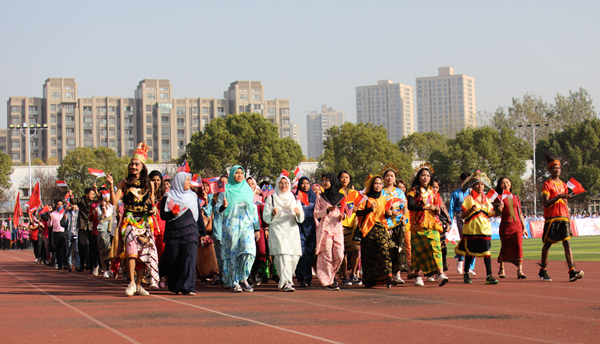 据悉,这些留学生分别来自印度尼西亚、马来西亚、老挝、泰国、柬埔寨、吉尔吉斯斯坦等国家。他们踏着轻快的步伐,面带微笑,身着传统服装。一边举着本国国旗与中国国旗,一边向大家招手,微笑,成为运动场上一道靓丽的色彩,引来了许多驻足的目光。现场同学们的气氛变得异常激动,欢呼招手,得到外国留学生们的热切回应,不同的肤色,不同民族,却因为聚在同一个地方而变成了彼此的伙伴,使各国的文化习俗相互融会贯通。