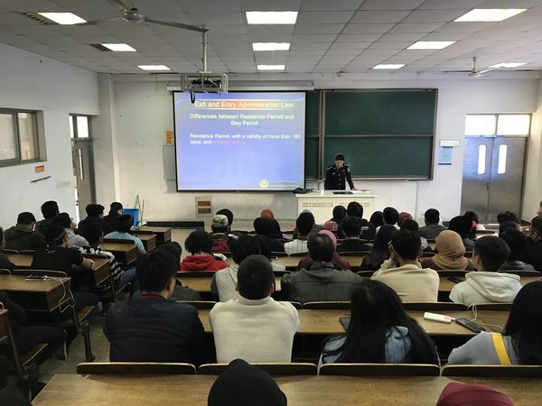 本次专题讲座是国际教育学院留学生安全教育系列活动之一。国际教育学院将邀请出入境管理处、雪浪派出所的警官为留学生开展法律法规教育纳入常规工作,建立长效机制,增强了留学生的法律意识,确保了留学生管理事故的“零”发生。