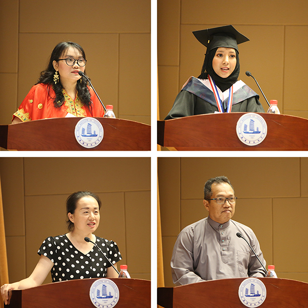 朱爱胜书记在毕业贺词中向2019届留学生毕业生顺利完成学业表示祝贺,并鼓励毕业生用所学的知识与技能为自己国家的发展作出贡献,努力成为国际友好传播使者,促进中外文化交流。马来西亚管理与科学大学副校长Eddy Yusuf先生、印尼特里萨克迪运输与物流学院副校长Juliater Simarmata先生分别代表海外高校对跨国分段联合培养的16名本科毕业生顺利完成学业表示祝贺,高度认可我校的外国留学生培养工作,并就进一步加深与我校稳固的合作表达了强烈的意愿。吴慧媛副校长宣读了优秀毕业生、结业生、毕业生的相关决定。龚方红校长身着学位服为毕业生一一行拨穗礼、颁发毕业证书、赠送纪念品,并合影留念。