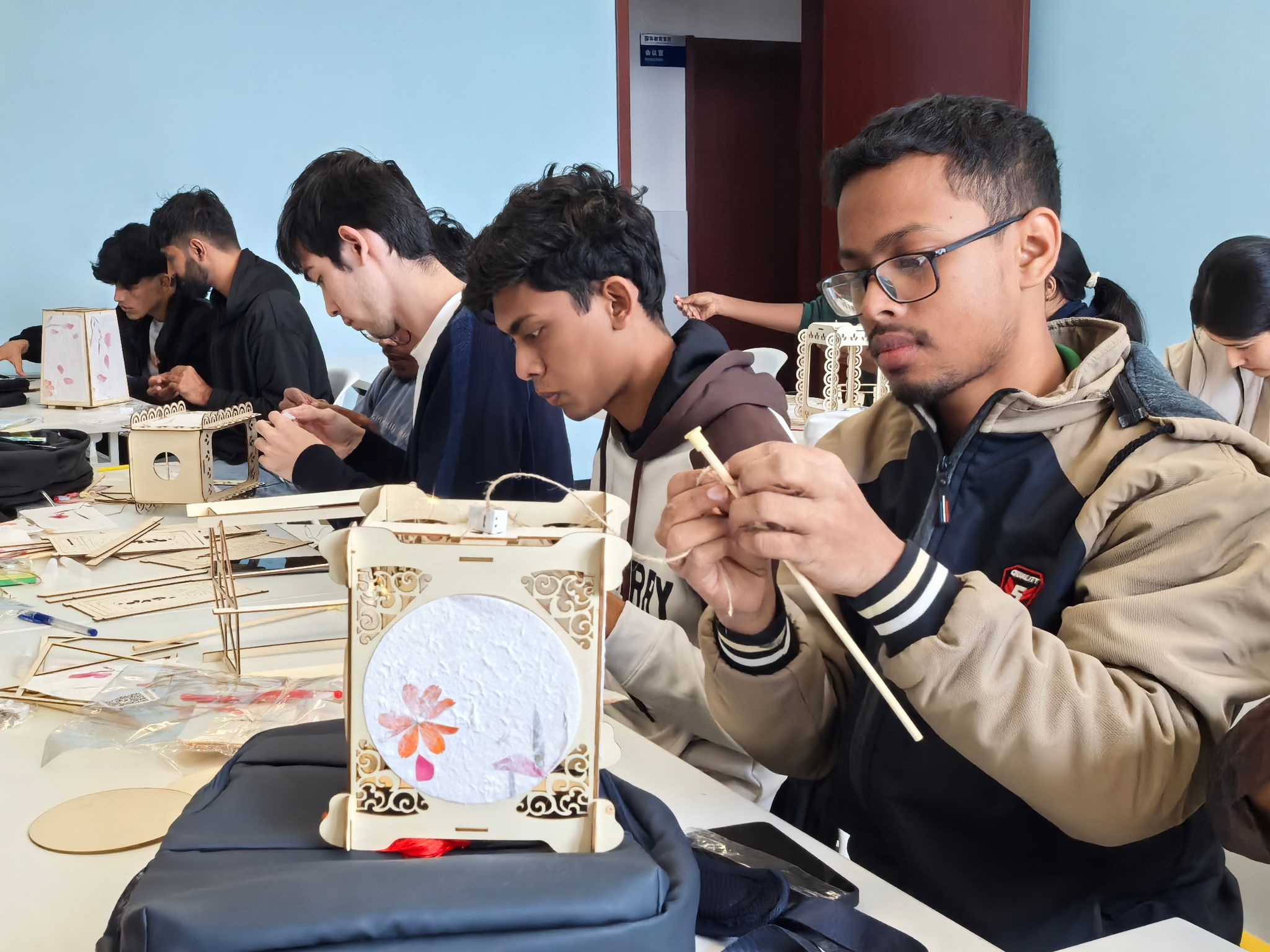 活动在轻柔的中国传统音乐中拉开帷幕。破冰环节的“光影接龙”迅速拉近了彼此距离。在了解灯笼承载的“团圆与希望”文化寓意后,同学们在罗老师的引导下进入专注的创作阶段。裁剪宣纸、描绘图案、组装灯架,指尖的细致操作成为凝聚注意力的“正念练习”。随着一盏盏独具特色的灯笼渐次成型,活动迎来了最动人的“点亮仪式”——室内灯光暗下,四十盏手工灯笼同时亮起,温暖的光芒瞬间照亮了整个空间,也映照出同学们惊喜与感动的脸庞。在随后的分享中,巴基斯坦学生艾哈迈德动情地说:“这盏灯让我想起了家乡的节日,虽然远离家人,但在这里我感受到了同样的温暖。”杨意健同学则表示:“教国际同学做灯笼的过程,让我对传统文化有了新的理解。”